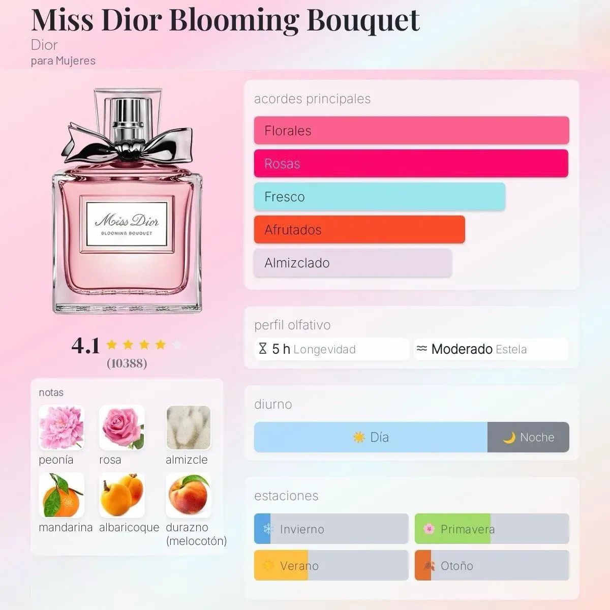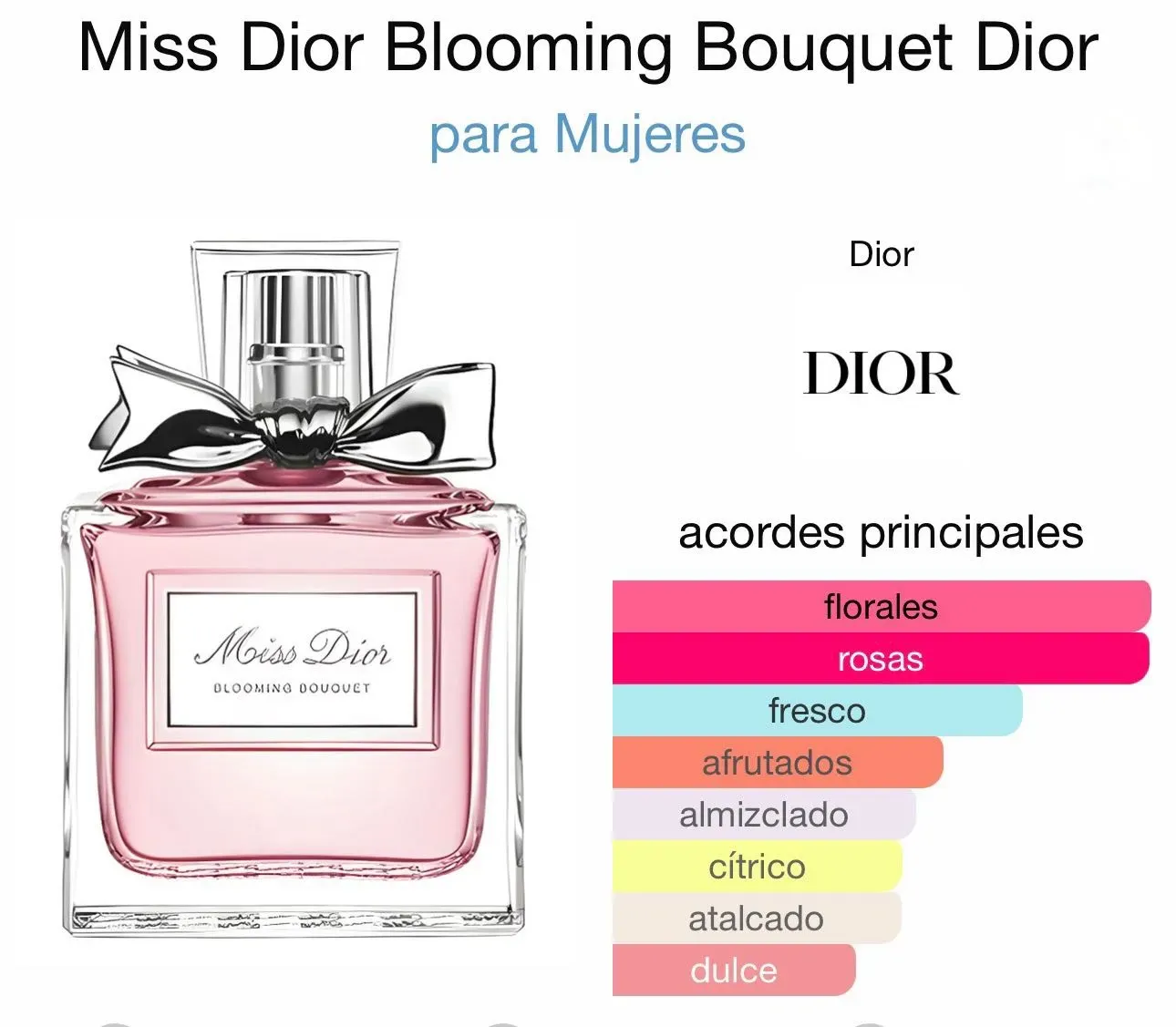 Miss Dior Blooming Bouquet de Dior es una fragancia de la familia olfativa Floral para Mujeres. Miss Dior Blooming Bouquet se lanzó en 2014. La Nariz detrás de esta fragrancia es Louise Turner. La Nota de Salida es mandarina siciliana; las Notas de Corazón son peonía rosa, rosa de Damasco, chabacano...