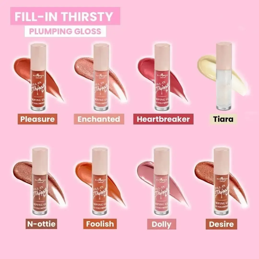 ¡Fill-In Thirsty Coloured Plumping Gloss! Con una combinación única de vitamina E, color y brillo, este brillo hará que tus labios se vean más carnosos e hidratados que seguramente llamarán la atención. Cobertura construíble de media a completa + voluminizador.
